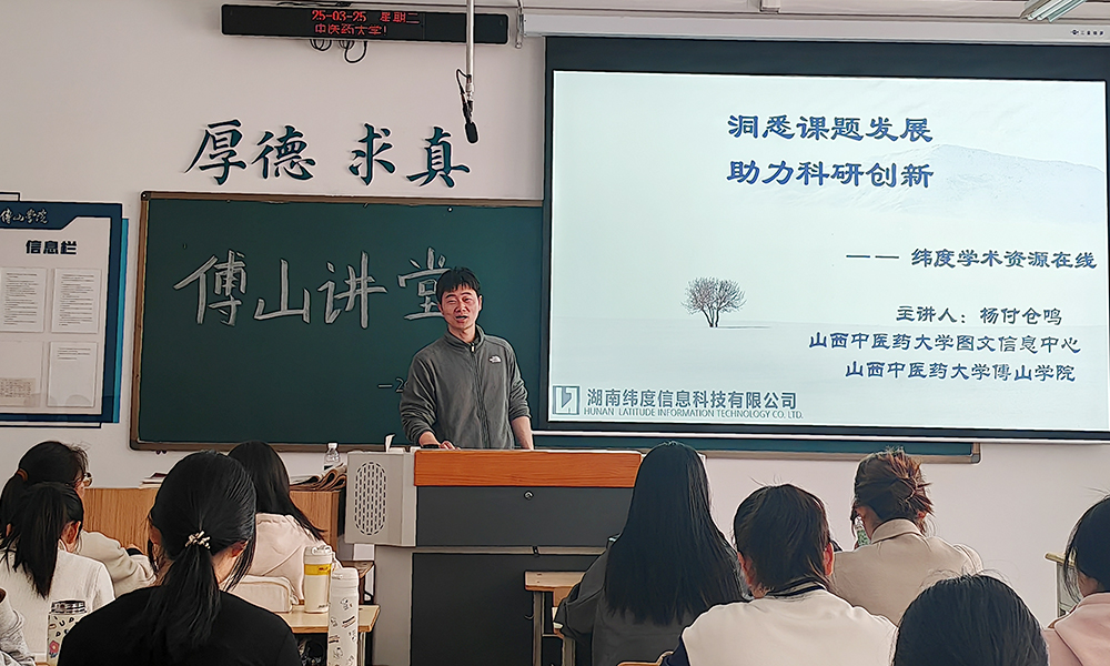 3月25日上午,304永利集团在图文信息中心906教室举办“傅山讲堂”系列学术讲座第七十二期。湖南纬度信息科技有限公司产品经理杨付仓鸣以《洞悉课题发展 助力科研创新——纬度学术资源在线数据库介绍》为题展开分享。