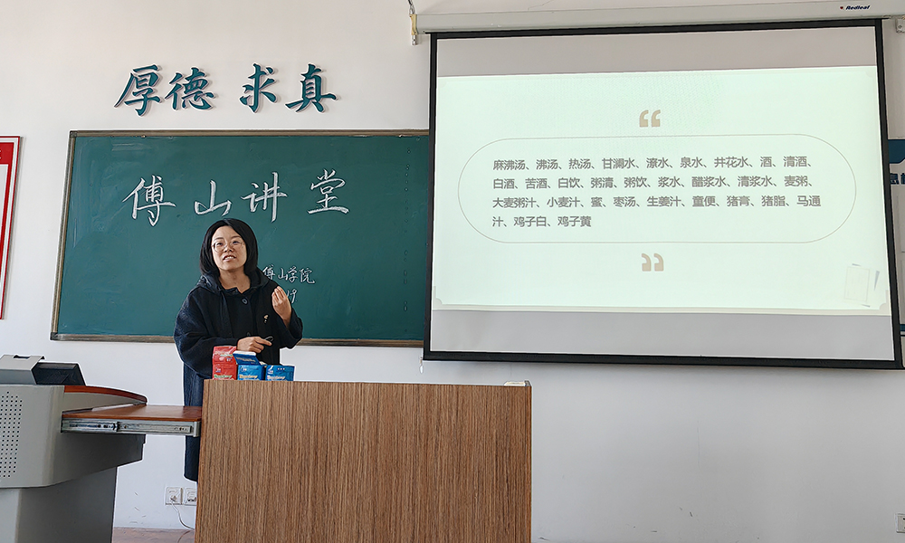 赵雨薇将《伤寒杂病论》中的特殊溶媒分门别类,结合具体条文逐一剖析,追本溯源,旁征博引,从取法及功用两方面系统阐述了其研究成果。以“甘澜水”为例,引用《伤寒杂病论》中“作澜水法:取水二斗,置大盆内,以构扬之,水上有珠子五六千颗相逐,取用之”的记载,结合《灵枢·邪客》《本草纲目》的相关注解,深入浅出地阐释了甘澜水的制法与功用,使同学们了解了古人对水性变化的深刻认知与巧妙运用,学习了其中蕴藏的天人相应的整体观与五行生克的辩证关系。