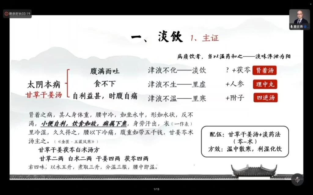 曹灵勇系统阐释了《金匮要略》中痰饮、悬饮、溢饮、支饮四类病证的病机与辨证要点,指出“阳虚”为痰饮形成的核心病机,强调“病痰饮者,当以温药和之”的根本治则,阐明温药具有助阳化气、调和脾胃之功。在临床实践方面,他详细讲解了甘草干姜汤、苓桂术甘汤等经典方剂的适用证候与化裁方法,并结合案例说明如何根据具体病情灵活加减。此外,他对痰饮郁而化热等复杂病机的诊疗思路提出了在温化基础上兼顾清热的治疗策略,为同学们临床实践提供了清晰的理论指导和实用的操作方法。