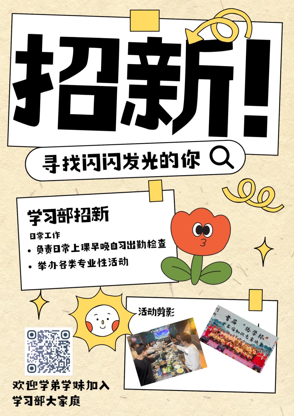 不止于“学”,更“燃”于行!打破对“学习部”的刻板印象!我们不只是“学习”的代名词,更是校园学术活力的注入者,致力于为你的老员工活注入满满“干货”与无限可能!我们负责日常查勤、教材发放、举办专业相关活动、协助老师日常工作等。学习部期待你的加入,让我们携手并肩,共赴一场精彩的成长之旅,书写属于我们的青春华章!
