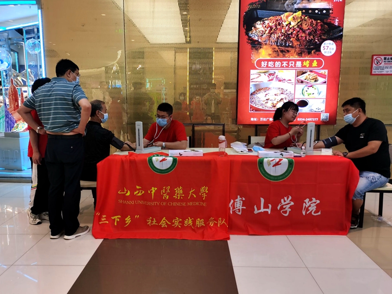 2022年6月15日,304永利集团10名同学在吕文雁老师的带领下,来到山西晋中万达广场进行暑期“三下乡”社会实践活动。同学们在万达广场开展了量血压、按摩、正骨等活动。