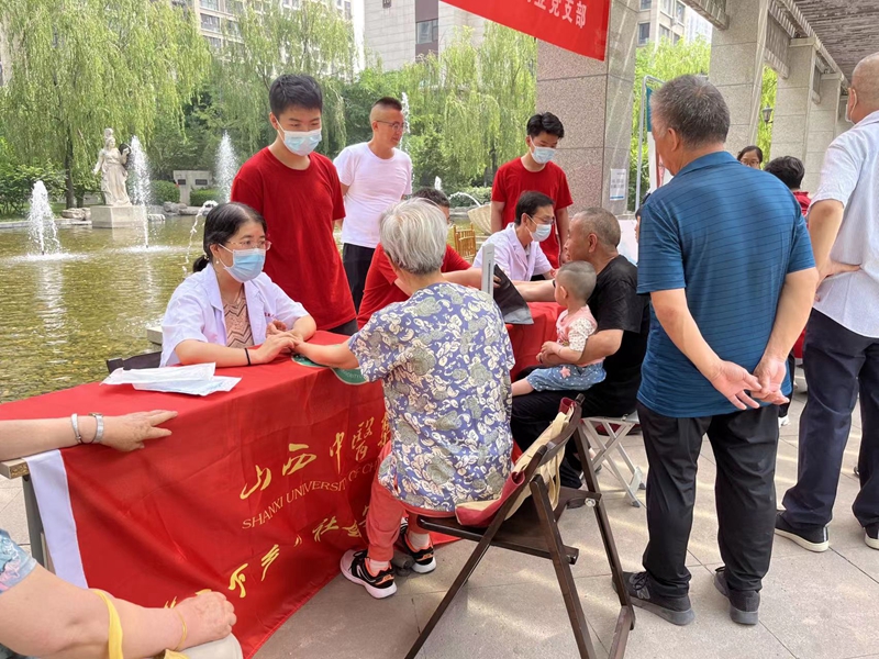 在活动现场,小区居民们络绎不绝,四位老师很热心的为前来问诊的群众一一答疑解惑。四位老师从事临床工作多年,具有丰富的临床诊疗经验,熟知各类疾病并对症下药。老师们为大家免费提供量血压、号脉开方、推拿按摩等一系列中医特色项目。在义诊的同时也为大家讲解了中医养生保健等健康知识,居民们拍手称绝。同学们从旁观察学习,并将所学的理论知识与实际操作相结合,对中医的学习理解进一步加深。在义诊活动中,同学们认真思考、积极提问、跟随名师学习;老师们认真负责、耐心讲解,在给病人诊治地过程中尽可能向同学们传授更多更有用的临床经验。